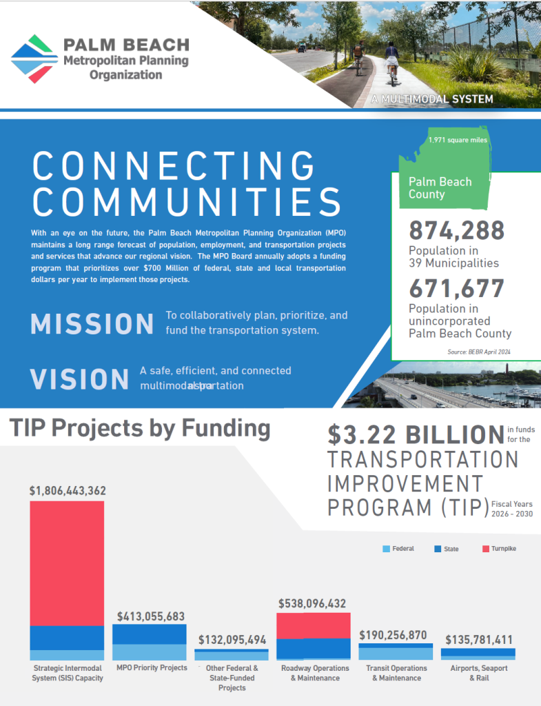 The Palm Beach Metropolitan Planning Organization (MPO) serves as the federally designated MPO for Palm Beach County, Florida. The MPO’s mission is to plan, prioritize, and fund a safe, efficient, and connected multimodal transportation system.