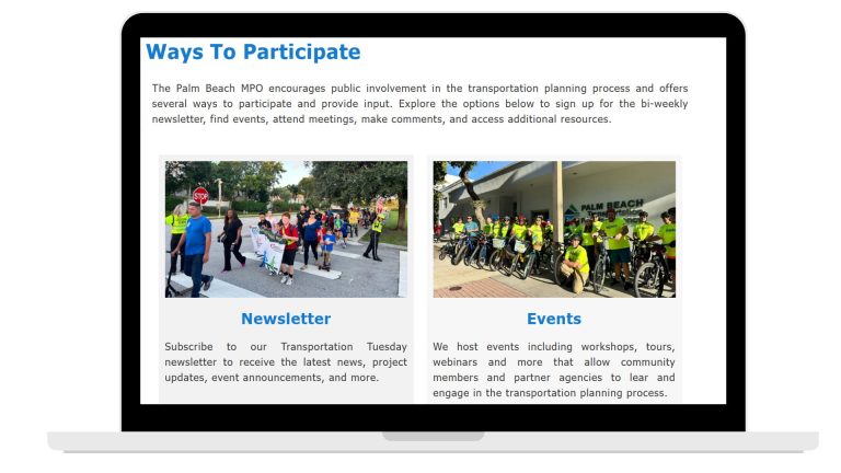 Get Involved! The Palm Beach MPO encourages public involvement in the transportation planning process and offers several ways to participate and provide input. Visit the “Ways to Participate” page on our website to explore