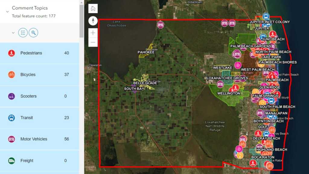 This interactive map allows viewers to enter transportation-related comments, suggestions and questions in Palm Beach County. Share your feedback with us by entering your comments on the map.
